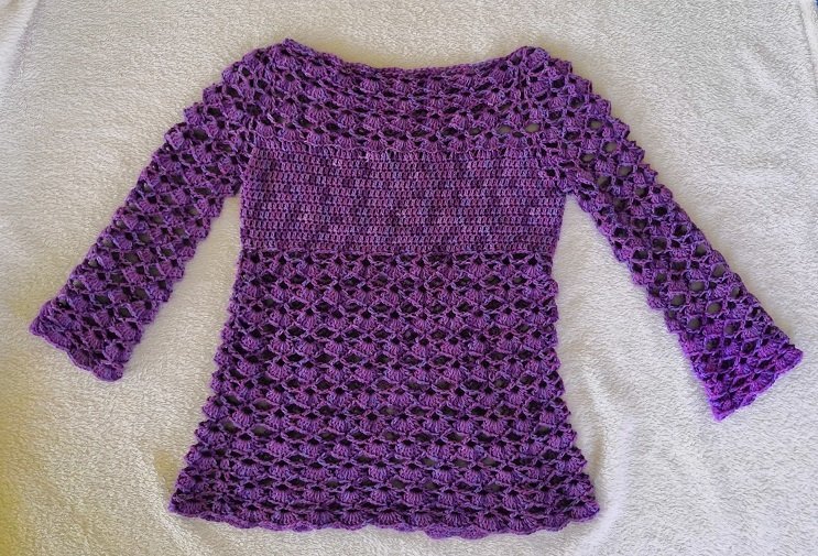 Die Tunika wird in einem Stück von oben nach unten gehäkelt. Die längeren Ärmel werden optional später angehäkelt.