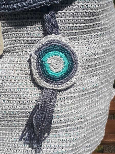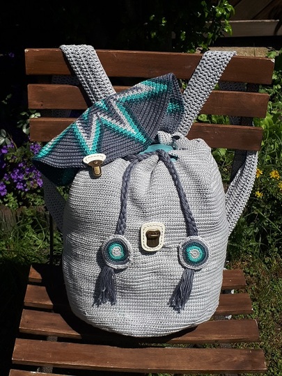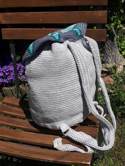 Dieser wunderschöne Rucksack wird an einem Stück gehäkelt, die Fäden werden mitgeführt.