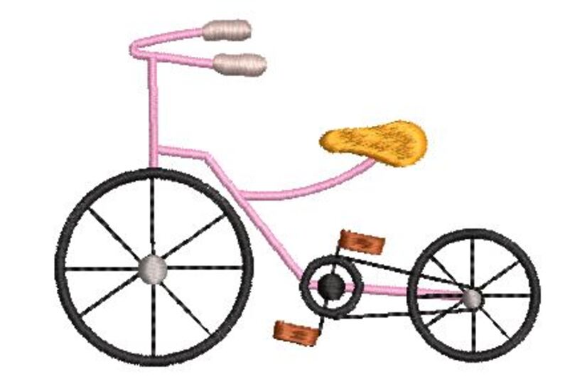 Bei der Stickdatei Button wird erst der Button vorgestickt, dann legt man den Stoff auf, der Stoff wird festgestickt. Außen herum überstehenden Stoff abschneiden, dann erfolgt die Applikation. Danach wird das Fahrrad gestickt.