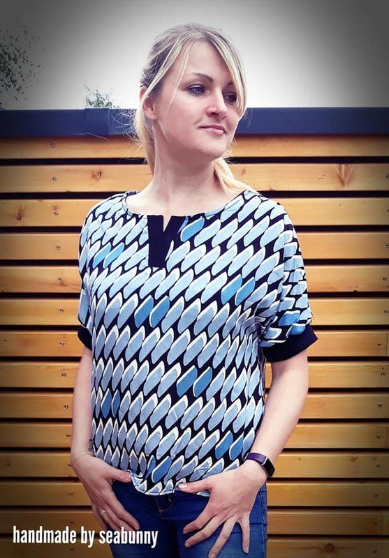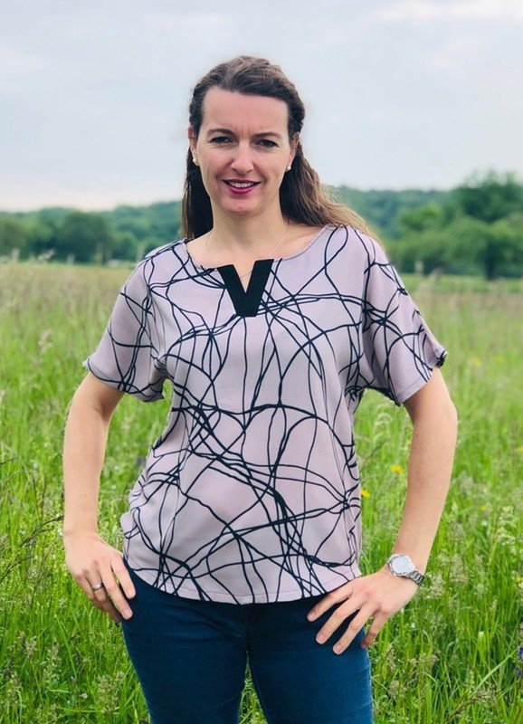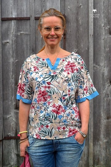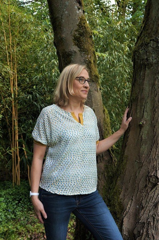 Bente ist eine locker bis weit fallende Bluse mit angeschnittenen Ärmeln und kleiner V-förmiger Ausschnitt Blende. Genäht wird sie aus Webware, idealerweise aus Viskose oder ähnlich weich fallenden Stoffen. Sie ist schnell genäht und durch ihre luftige Passform ein ideales Sommerteil. Die Ärmel kannst du entweder mit einem Bündchen versehen, so verleihst du ihr ein bisschen mehr Shirt Charakter, oder ganz einfach nur säumen. Die Bluse ist schnell genäht, einzig die Blende ist ein bisschen knifflig und erfordert ein wenig Geduld. Aber dank ausführlicher Schritt für Schritt Anleitung mit vielen Fotos ist dies auch für Anfänger mit etwas Näherfahrung gut umzusetzten. Allerdings ist es von Vorteil, wenn du schon einmal Webware verarbeitet hast.