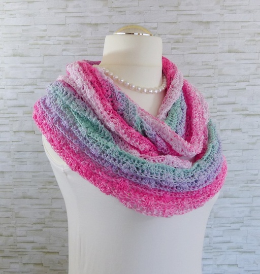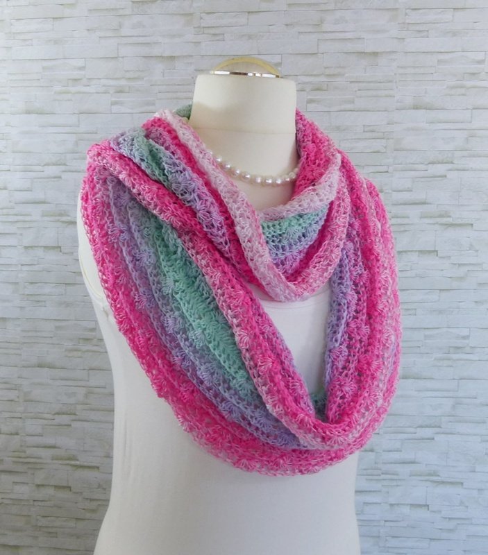 Der Möbiusschal kann theoretisch mit jeder Wolle angefertigt werden. Ob mit kuscheliger Farbverlaufswolle oder unifarben Wolle. Auch kann der Loop beliebig breiter und länger (auch Kindergröße) gehäkelt werden.