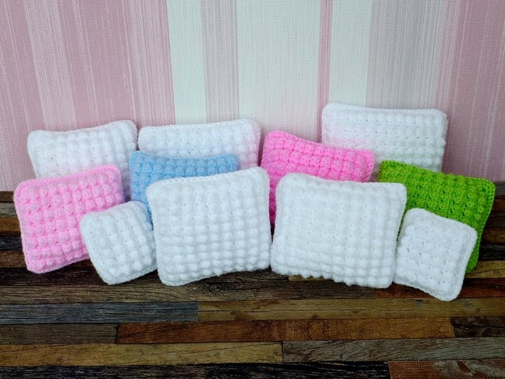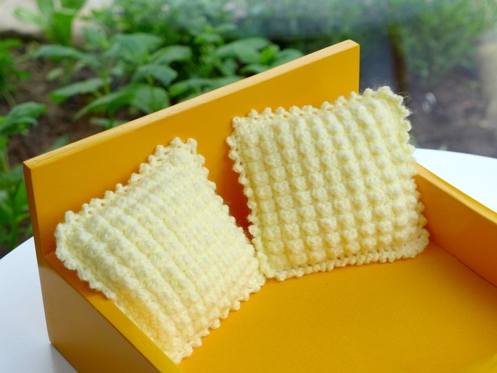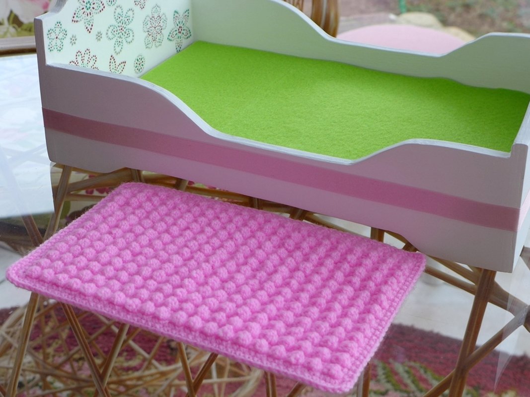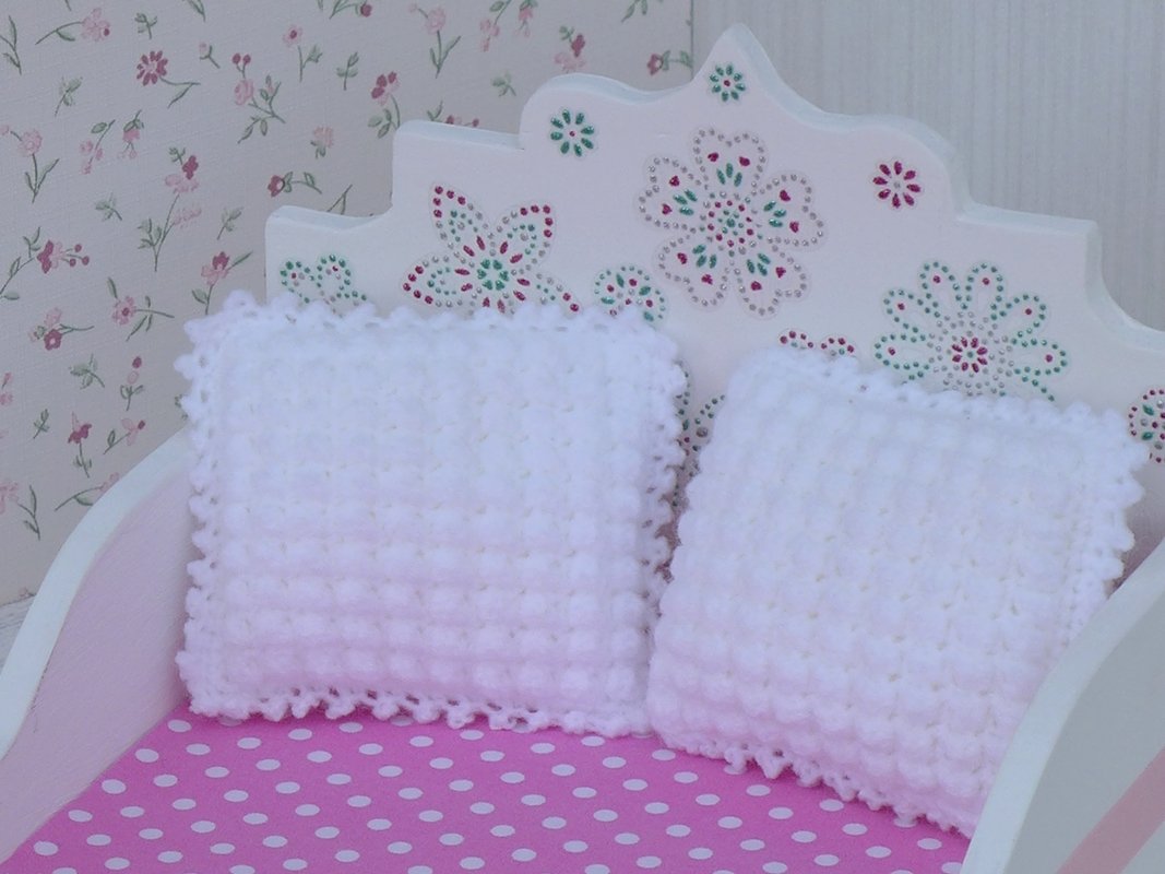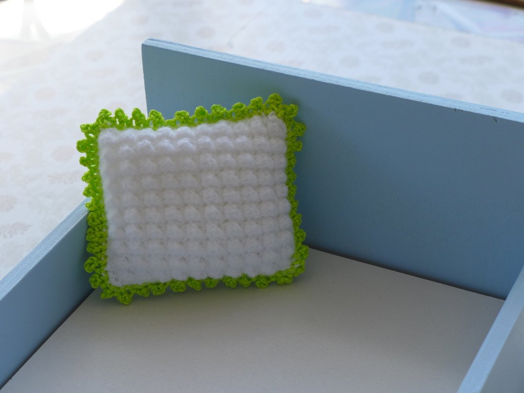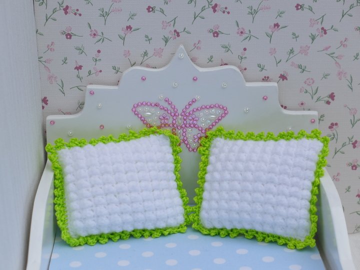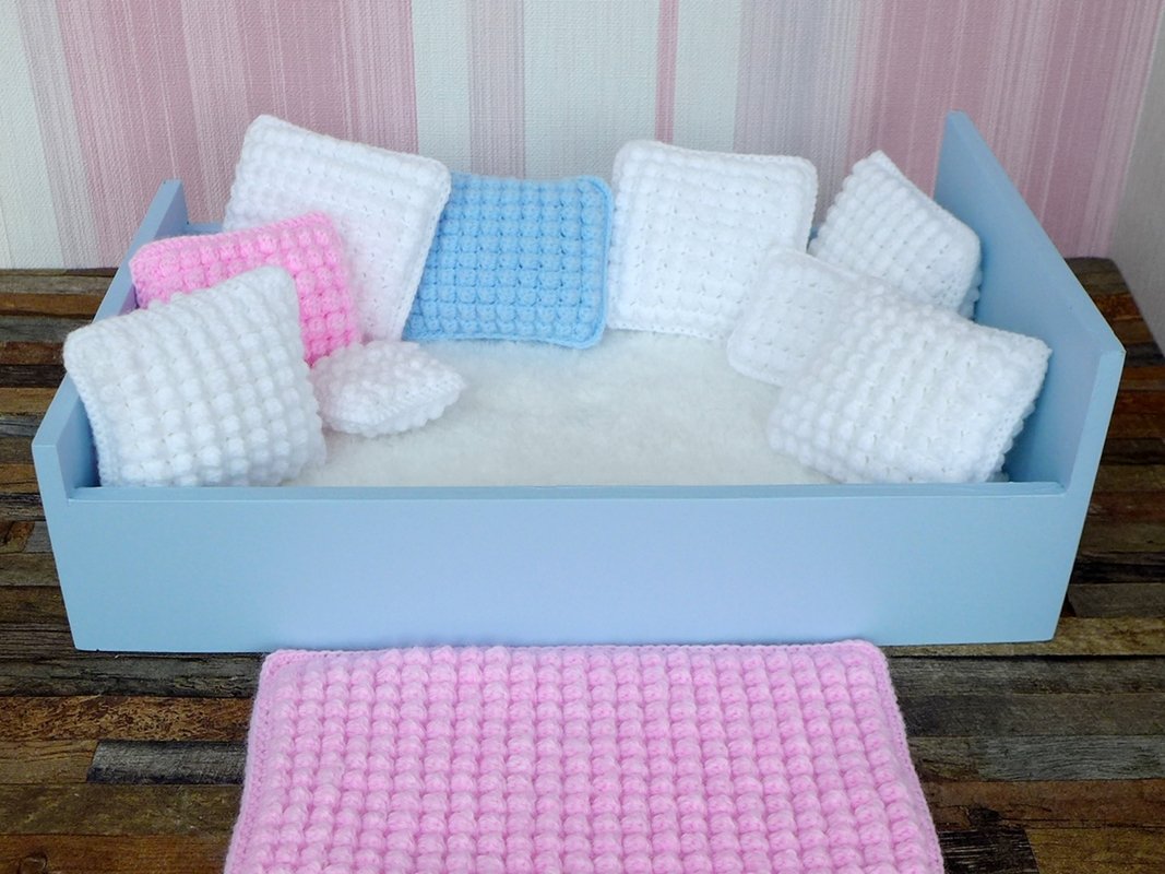 Ja genau: viele Kissen. Diese hier könnt Ihr in allen Größen und Farben selber häkeln. Sie passen ideal in mein selbstgebautes Puppenbett. Mit dem passenden Teppich im selben Design sieht es noch viel schöner aus.