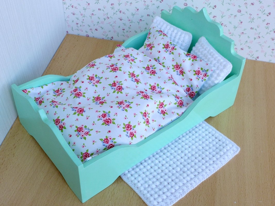 Das passende Bett sowie die dazugehörige Bettwäsche, die Ihr auf meinen Beispielbildern seht, könnt Ihr ebenfalls selber machen. Die Anleitungen gibt es separat in meinem Shop.