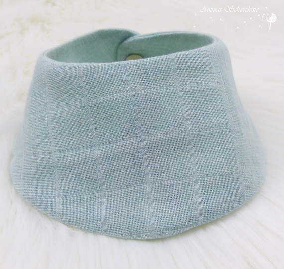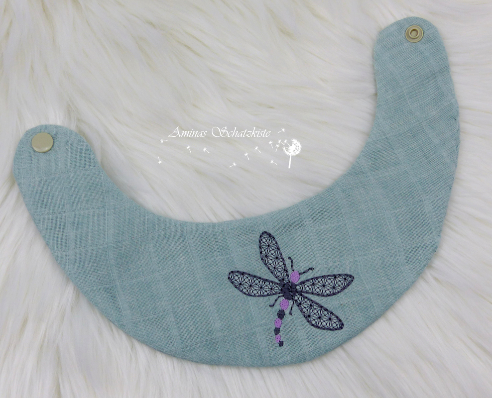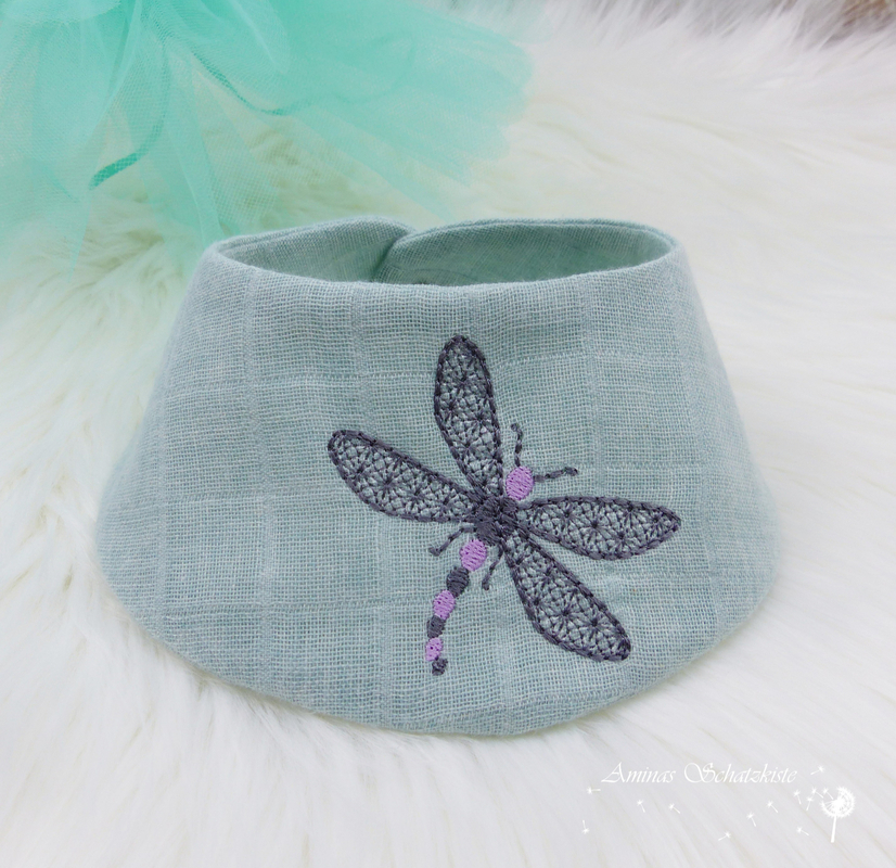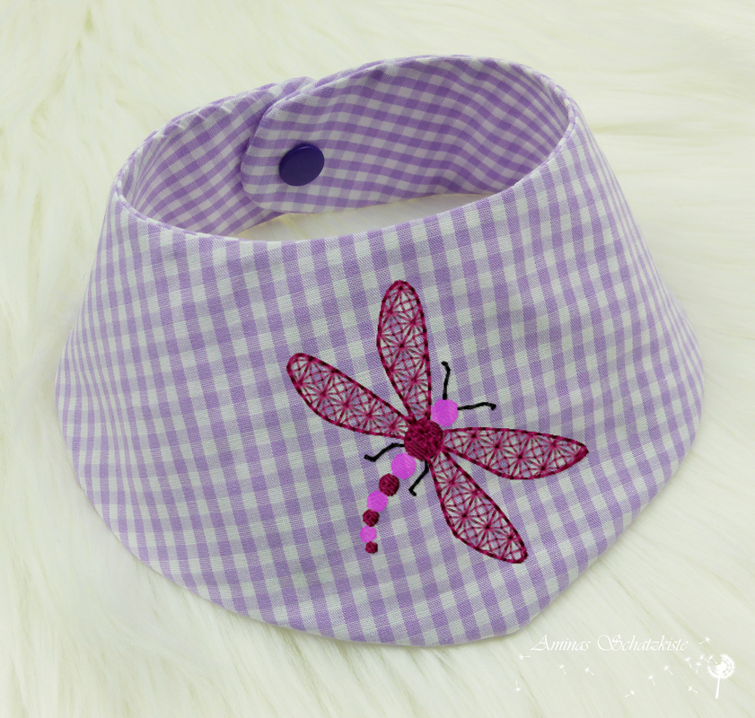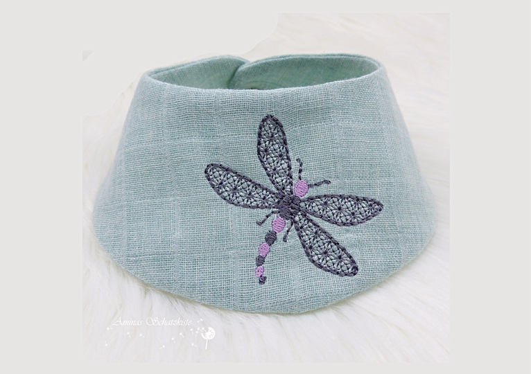 Halstuch für die Stickmaschine. Nur eine kleine Wendeöffnung wird zum Schluss mit der Hand oder der Nähmaschine geschlossen. Halsumfang ca. 30 cm, je nach Position des Druckknopfes. Größe der Libelle: 7,0 cm x 6,6 cm.