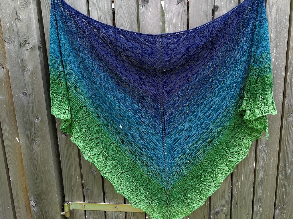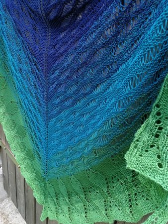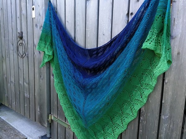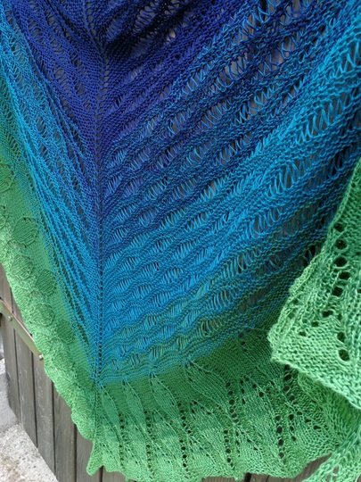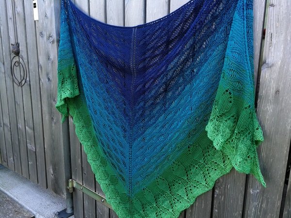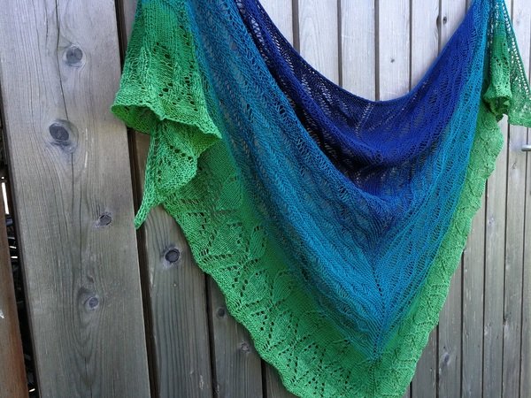 Das Tuch wird von oben begonnen, startet mit dem Wellenmuster des Waldsees und geht dann in das Waldmuster über. Es wird aus einem Bobbel in einem durch gestrickt. Beide Muster sind Endlosmuster und können beliebig lange gestrickt und somit den Farbtönen angepasst werden.