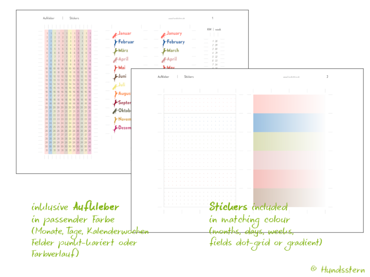 inklusive Aufkleber in passender Farbe (Monate, Tage, Kalenderwochen, Felder punkt-kariert oder Farbverlauf)
