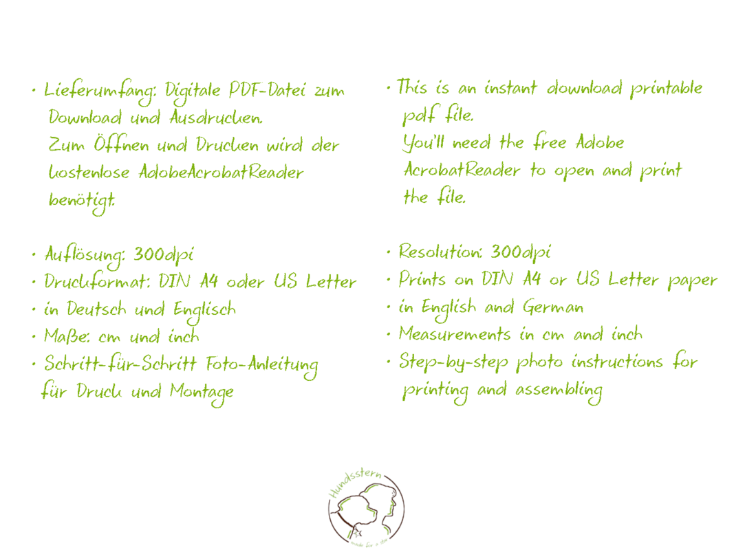 Lieferumfang: Digitale PDF-Dateien zum Download und Ausdrucken. Zum Öffnen und Drucken wird der kostenlose AdobeAcrobatReader benötigt. Sie können beliebig viele Exemplare ausdrucken.