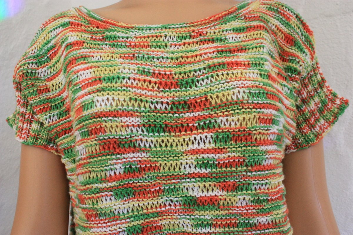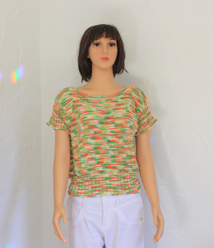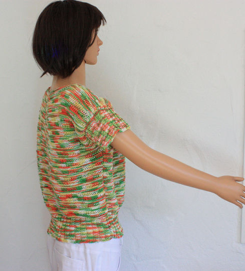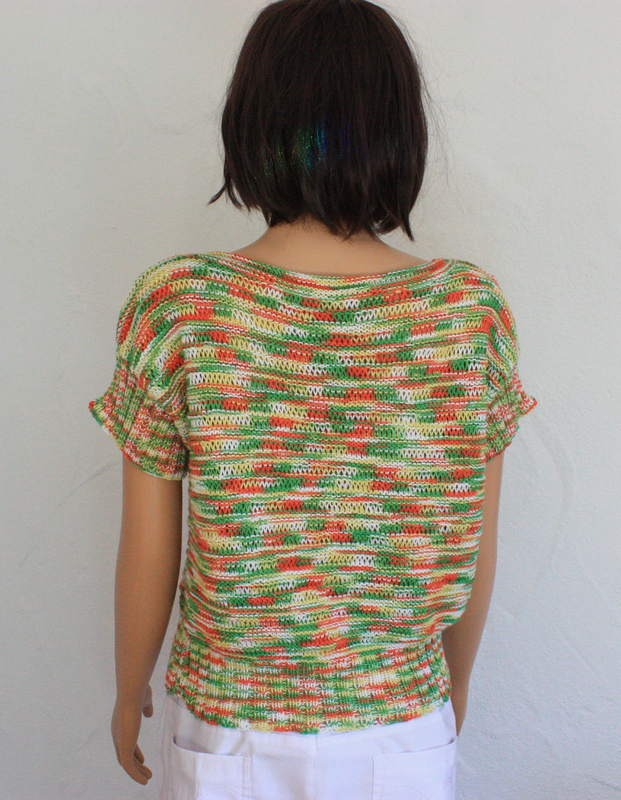 Die kurzen Ärmel werden einfach nur mit breiten Rippenbündchen angestrickt