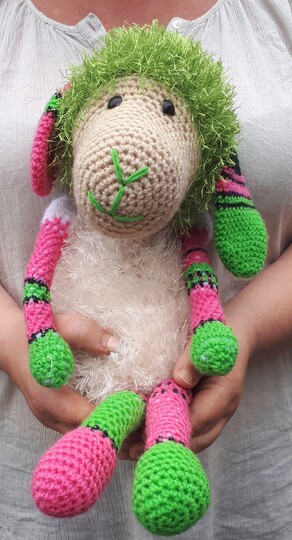 Das Schaf Merry ist ca. 35cm groß je nach Häkeleigenschaft.