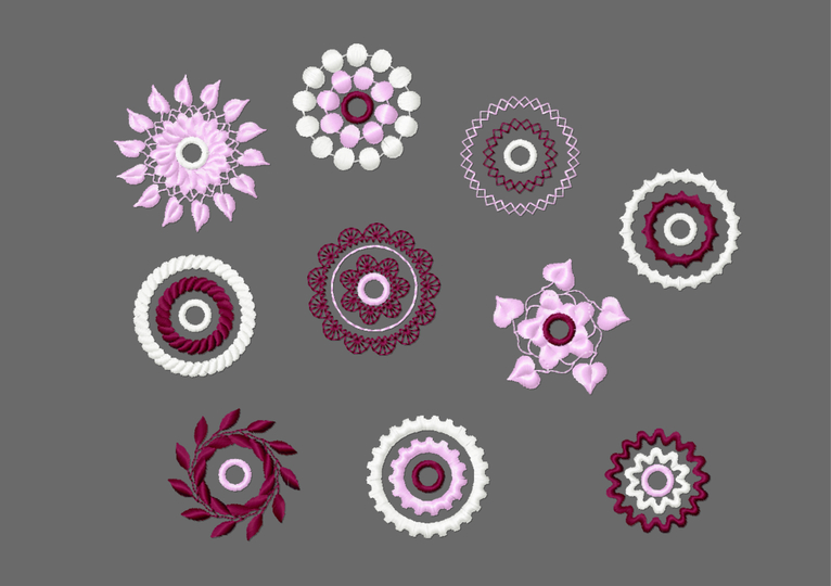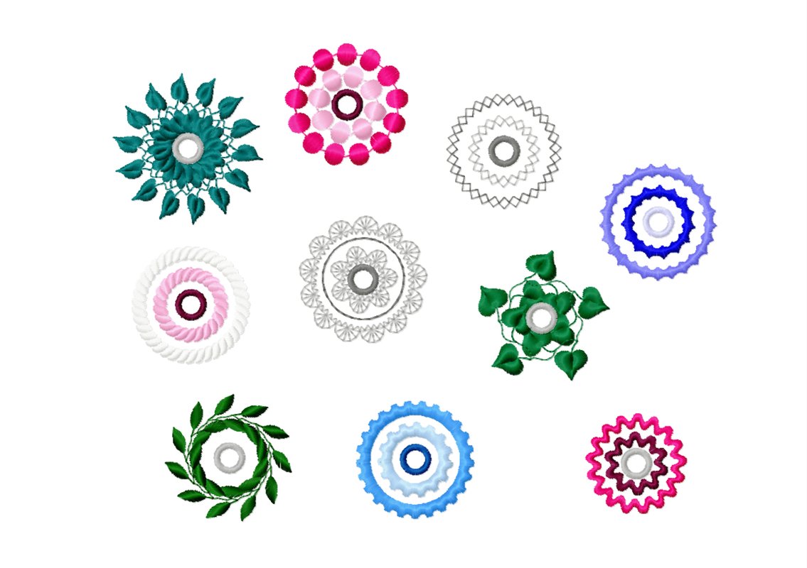 Zauberhafte Stickdatei verschönert einfache Druckknöpfe oder dient als Öse. Der mittige Durchlass beträgt ca. 1 cm. Die einzelnen Motive sind zwischen 3,8 cm und 5,6 cm groß. Auch ohne die Verwendung von Druckknöpfen ein toller Blickfang auf Kleidung, Taschen, Kissen usw.