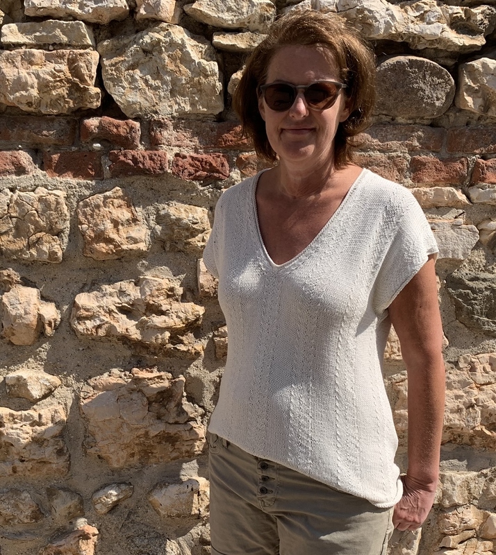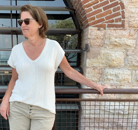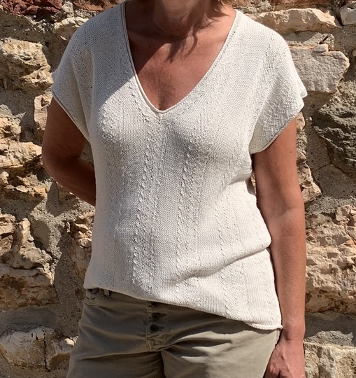Der Pullover wird nahtlos von unten nach oben mit einem V-Ausschnitt gestrickt. Die Saumbündchen werden separat in glatt rechts gestrickt.