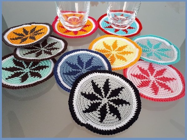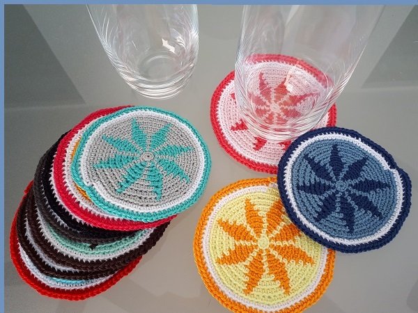Diese raffinierten Untersetzer werden an einem Stück in Spiralrunden gehäkelt, die Fäden werden mitgeführt.
