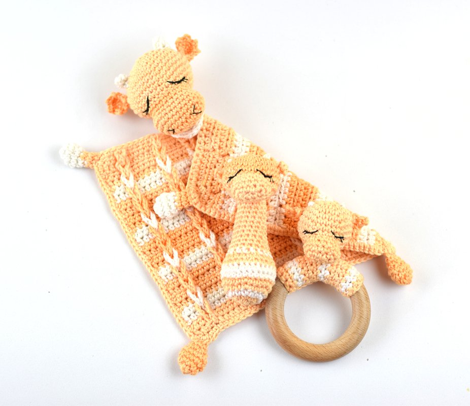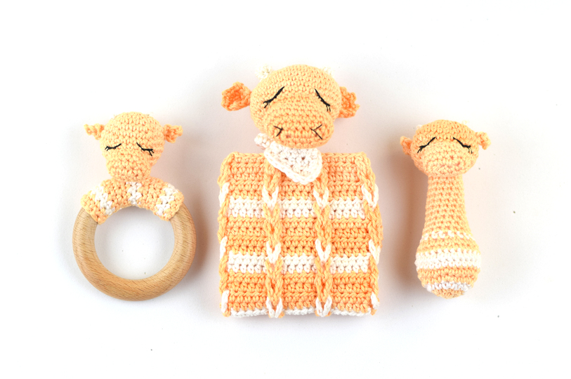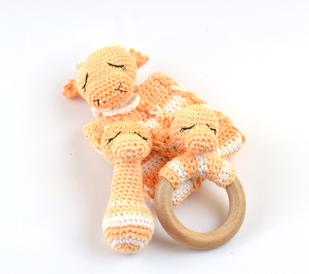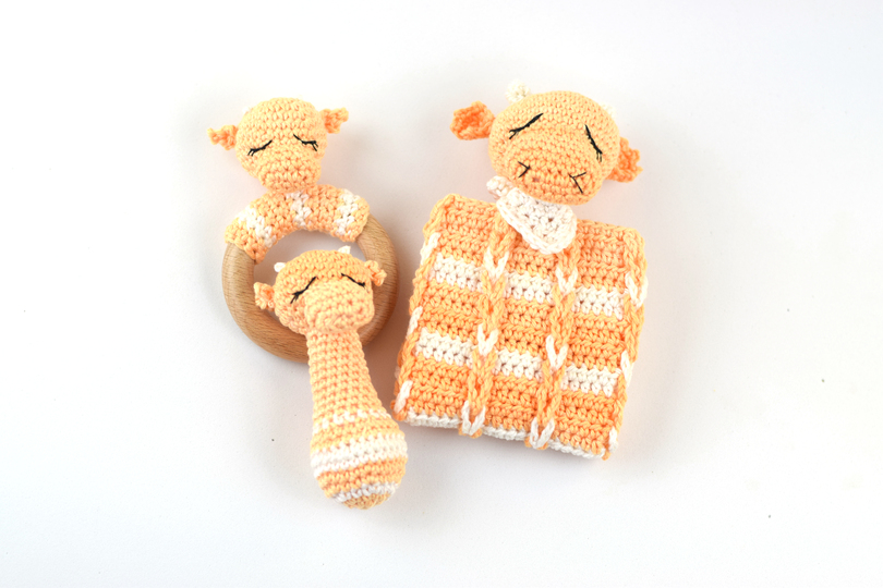 Bestehend aus Schmusetuch, Rassel und Greifling ist es das perfekte Anleitungs-Set für eine anstehende Geburt.