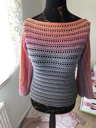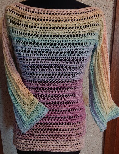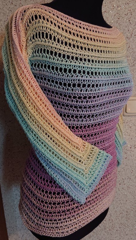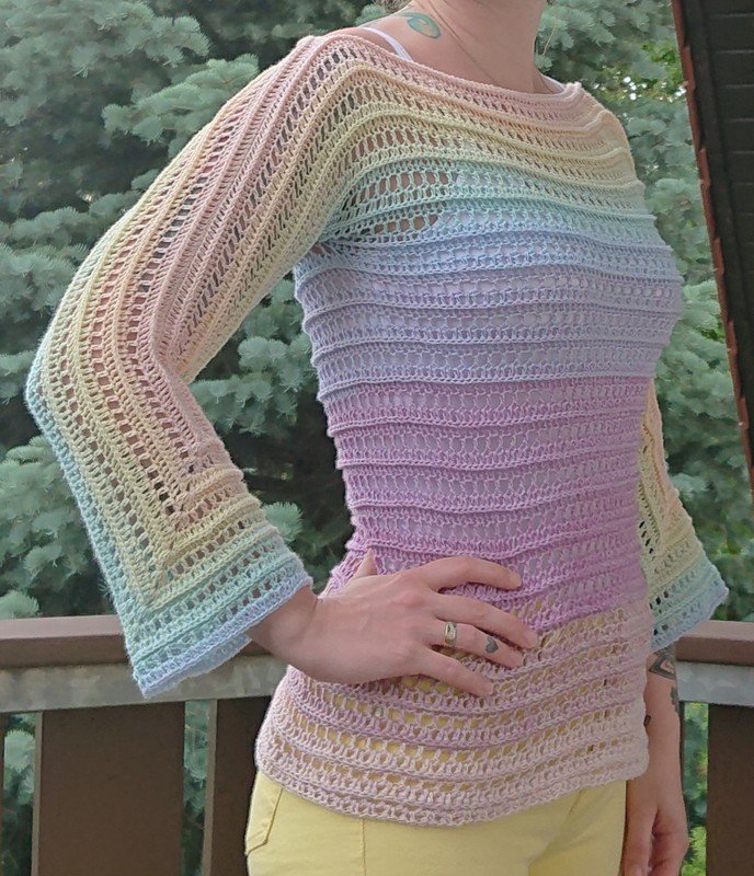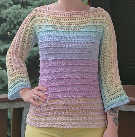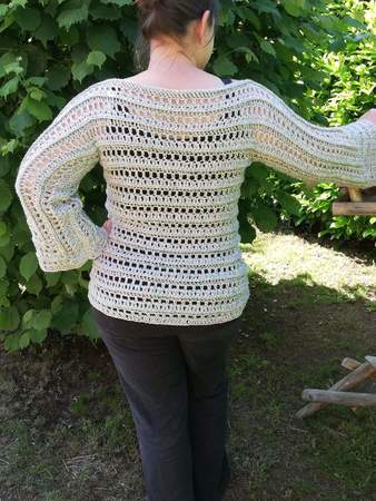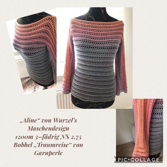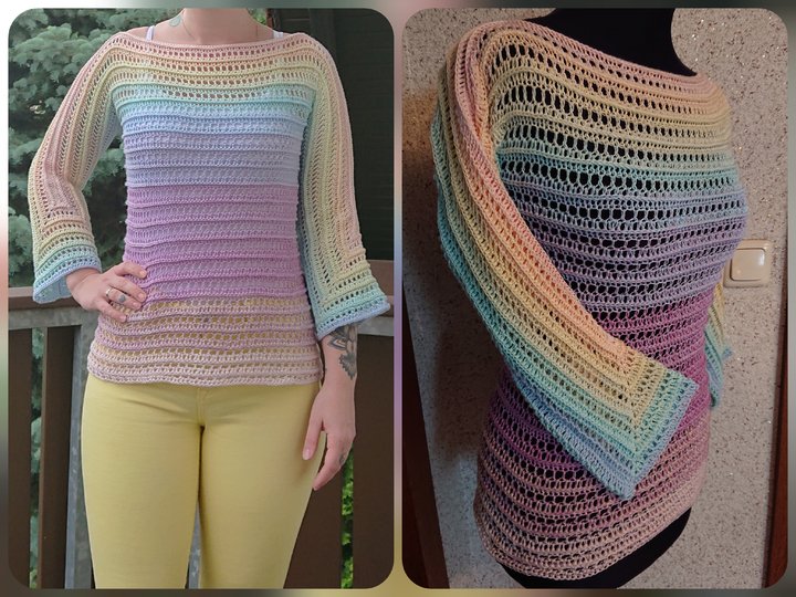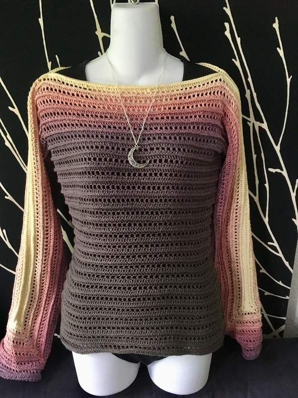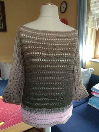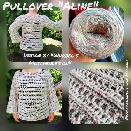 Der Pullover Aline wird in einem Stück gehäkelt. Auch die Ärmel werden direkt mit gehäkelt, weshalb der Pullover super für Farbverlaufsgarn geeignet ist, weil keine seperaten Ärmel-Bobbel benötigt werden.