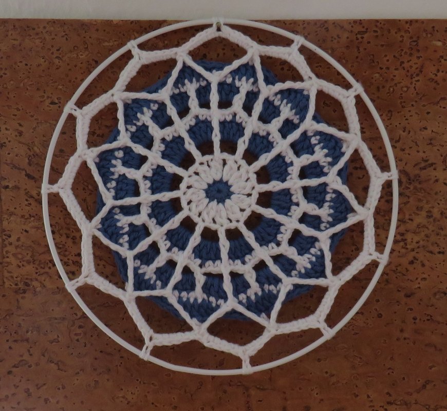 Der Metallring ist 20 cm im Durchmesser, das Mandala ebenfalls.
