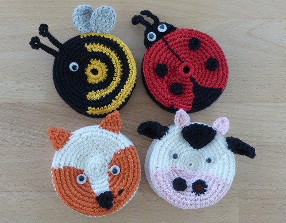 Die Anleitung zeigt dir, wie du die 4 Modelle Biene, Marienkäfer, Kuh und Fuchs häkeln kannst.