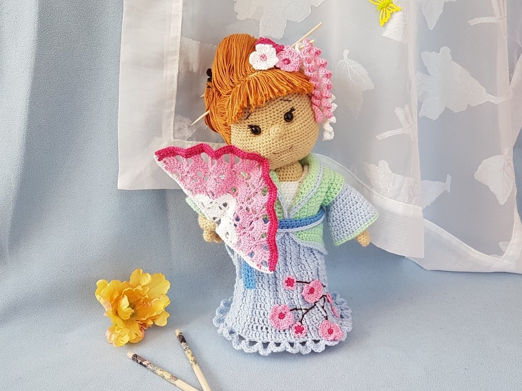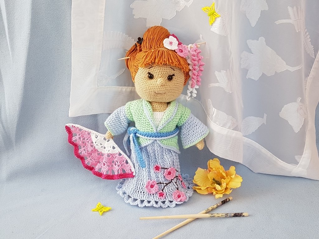 Die PDF beinhaltet die Anleitung für die Puppe, das Kleid, die Schuhe, die Jacke, sowie für den Fächer und den Kopfschmuck.