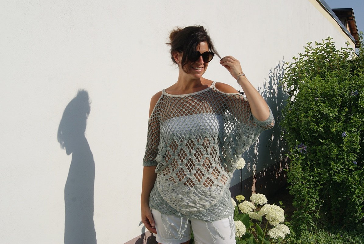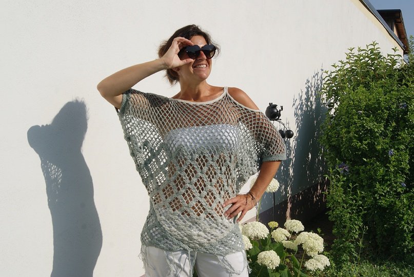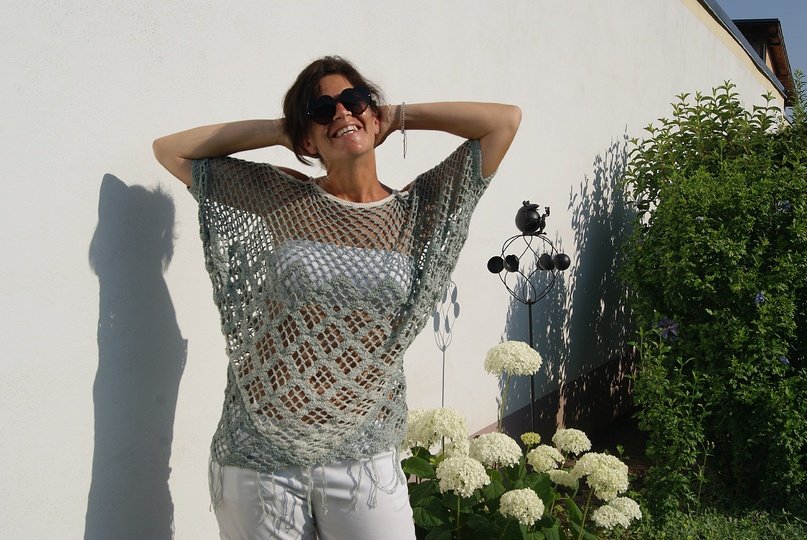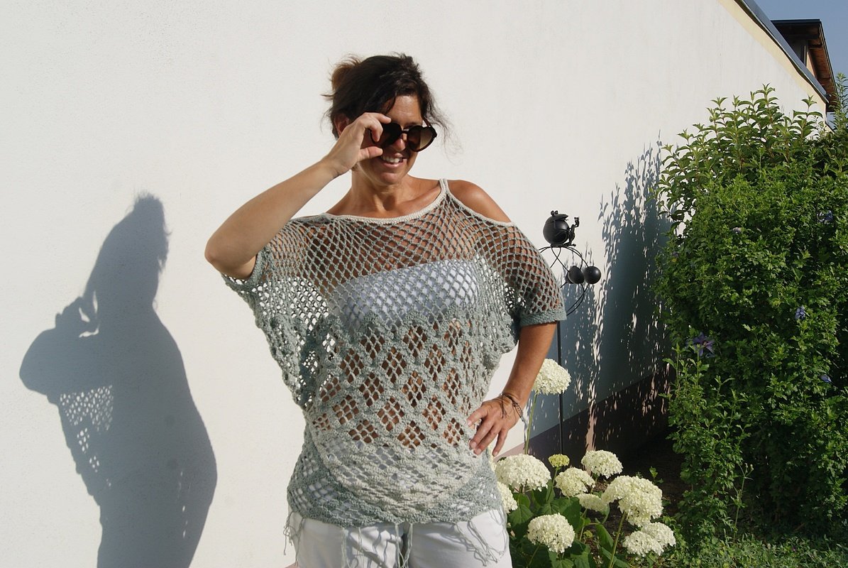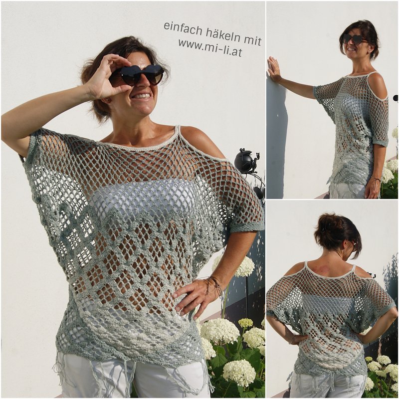 Raffinierte Tunika aus 4 Dreieckstüchern gehäkelt – hier kommen auch Tuchhäklerinnen auf ihre Rechnung und können ein wunderbares Oberteil zaubern. Ein Must HAVE und sicherer Hingucker für den Sommer! Für alle Größen leicht anzupassen!