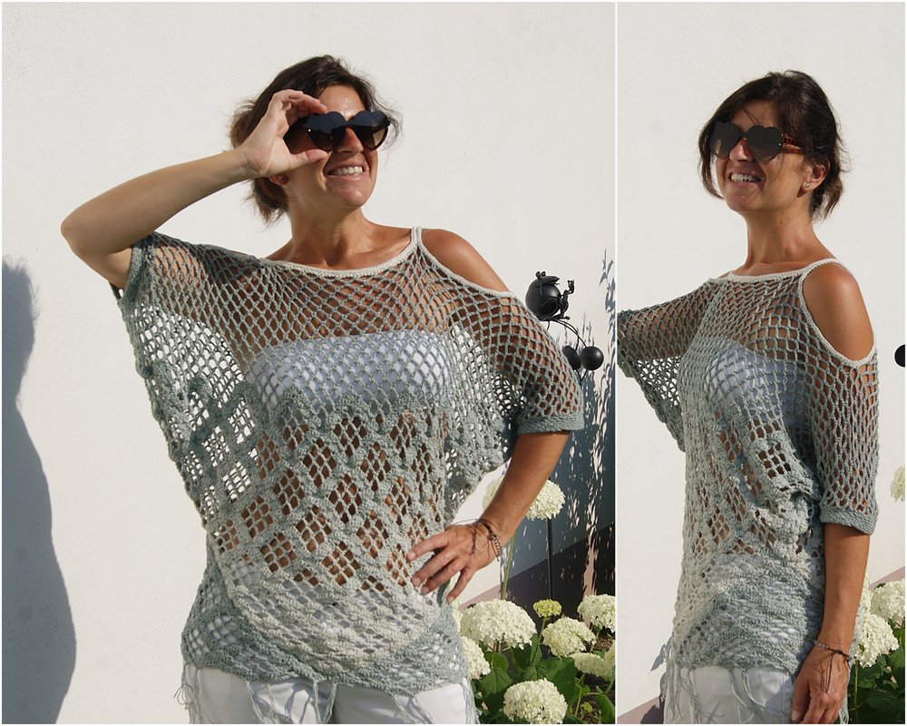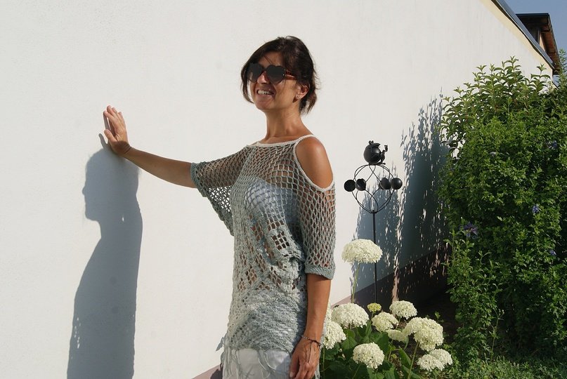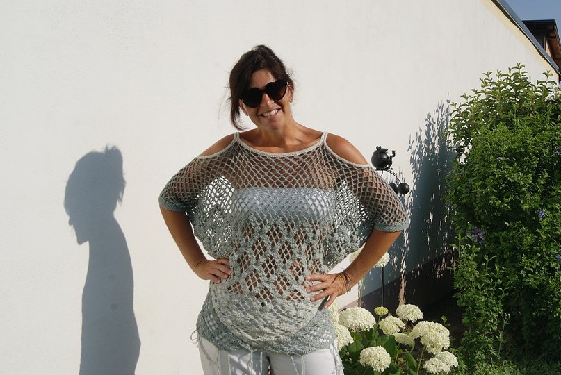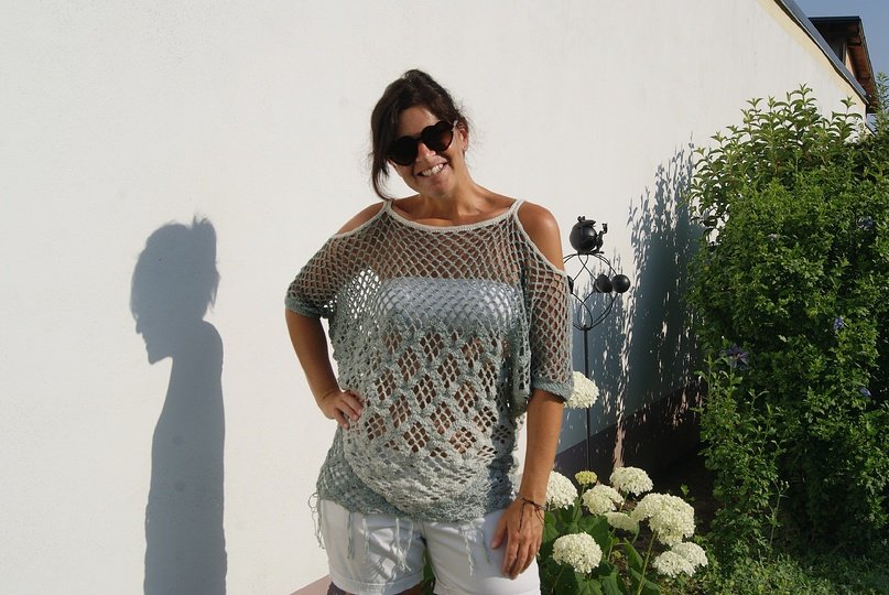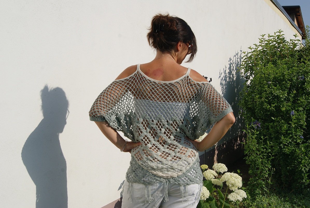 Raffinierte Tunika aus 4 Dreieckstüchern gehäkelt – hier kommen auch Tuchhäklerinnen auf ihre Rechnung und können ein wunderbares Oberteil zaubern. Ein Must HAVE und sicherer Hingucker für den Sommer! Für alle Größen leicht anzupassen!