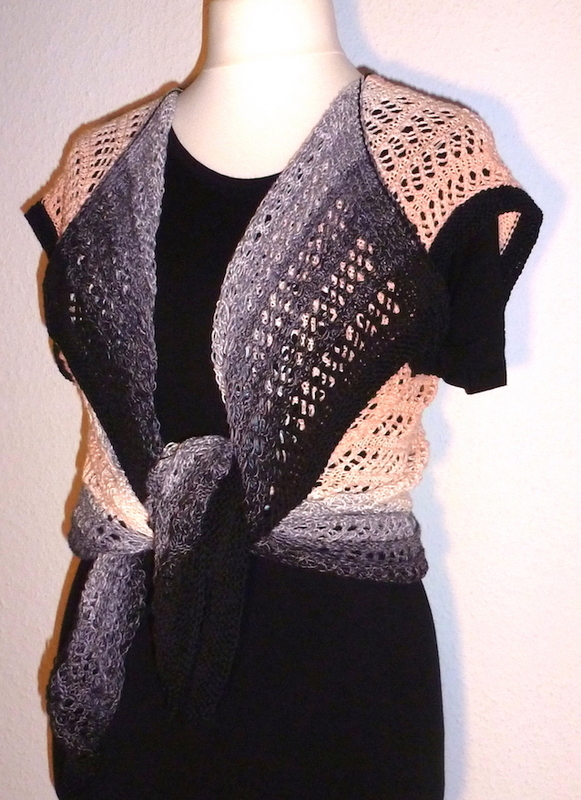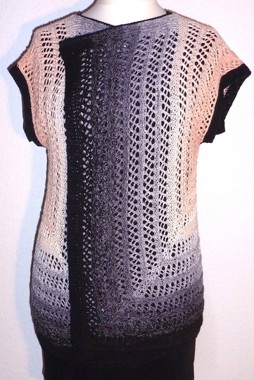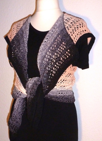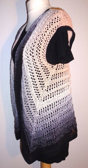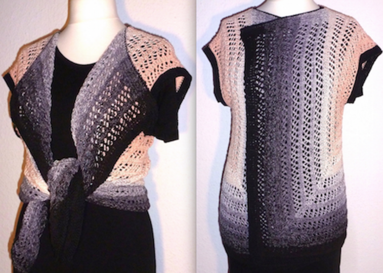 Das Eckgeflüster ist eine herrlich luftige Weste, die sich vielseitig tragen lässt. Gestrickt wird sie am Stück aus einem Bobbel. Die Größe entsteht beim Stricken, weshalb die Weste prinzipiell mit jedem Garn gefertigt werden kann und auch keine Maschenprobe erforderlich ist. Auch lässt sie sich an jede Größe anpassen. Variieren kann man auch die Größe der seitlichen Vorderteile - bis hin zu einer starken Zipfelform der Weste.