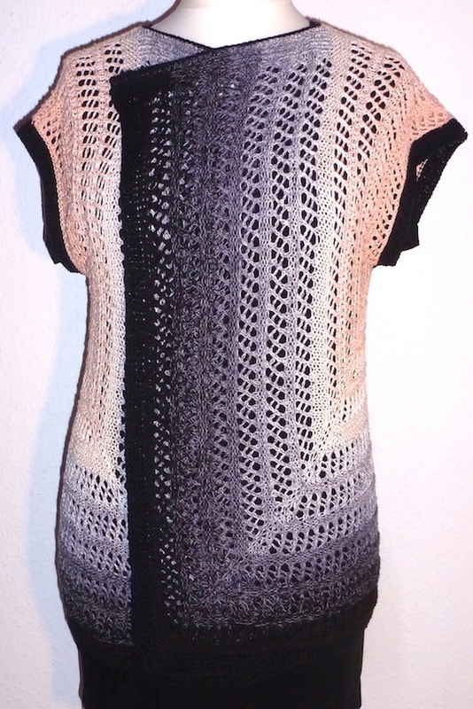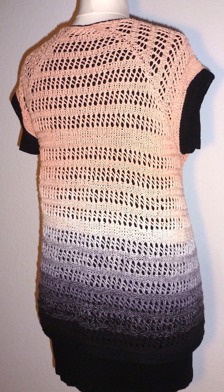 Für Größe 44 habe ich 800 m Farbverlaufsgarn verwendet (Cotton Kings Twirls "Peach Beryl" von hobbii), dazu