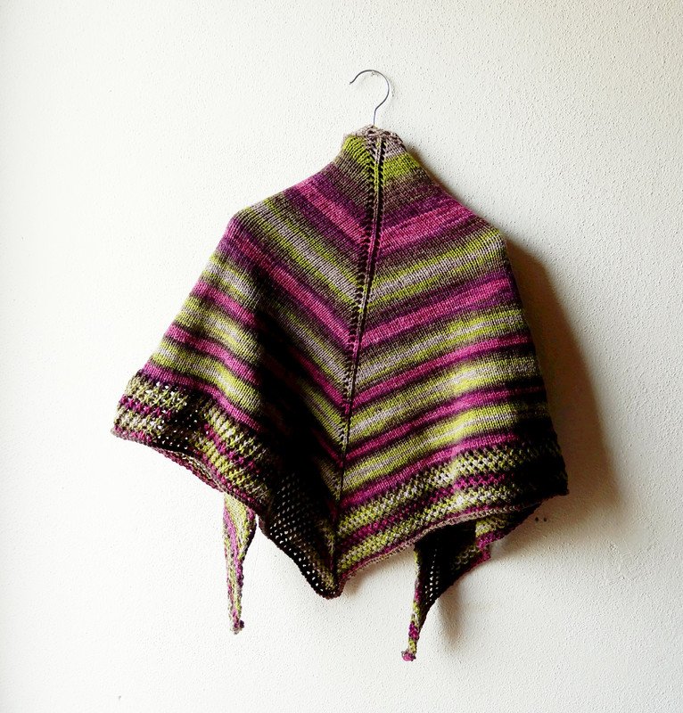 Das ist ein Dreieckstuch, bei dem man nicht viel nachdenken muss. Man kann es beim Fernsehen stricken oder während man in Gespräche verwickelt ist, auf Reisen im Auto oder einfach dann, wenn man etwas stricken möchte, das man jederzeit auf die Seite legen kann.