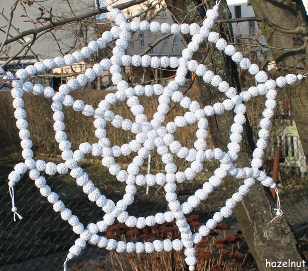 Ich habe das Spinnennetz mit Schachenmayr Catania und der Häkelnadel 2,5 gehäkelt. Das Spinnennetz wird dann ca. 47 cm hoch und breit.