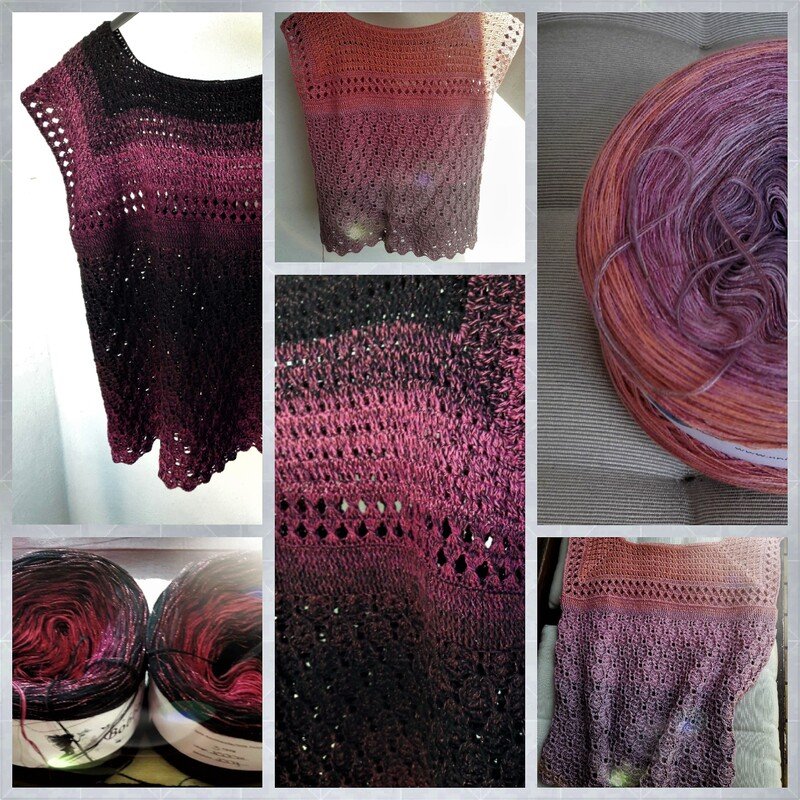 3 fädiger Bobbel (gefachtes Farbverlaufsgarn 50% Baumwolle und 50% Polyacryl) mit einer Lauflänge von ca. 250m/50g, gerne mit Lurex oder Cupro Beilaufgarn. Der ungefähre Verbrauch je Größe:
