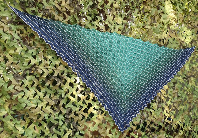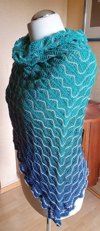 Nalu bedeutet "Welle" auf hawaiianisch. Und genau so sieht das Tuch auch aus. Der Farbverlauf von hellem Grün zu dunklem Blau entführt Dich an die See. Das Kontrastgarn macht die Wellen sichtbar und am Abschluß bilden sich kleine Wassertropfen auf den Wellenbergen.