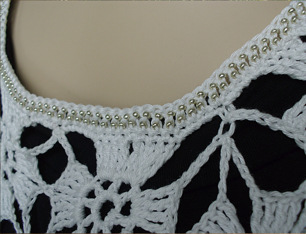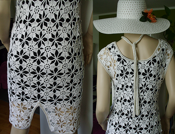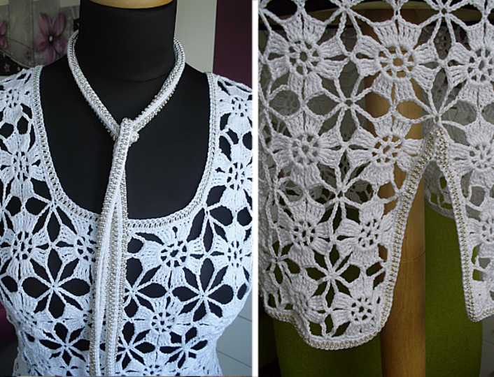 Dieses umwerfende Kleid wird aus vielen, vielen Quadraten zu einem Meisterwerk zusammengefügt und an Armen, Hals, Saum und Schlitz mit Perlen verziert. Ausdauer und Geduld sind gefragt, aber der Aufwand lohnt sich, denn das Ergebnis ist einfach traumhaft schön.