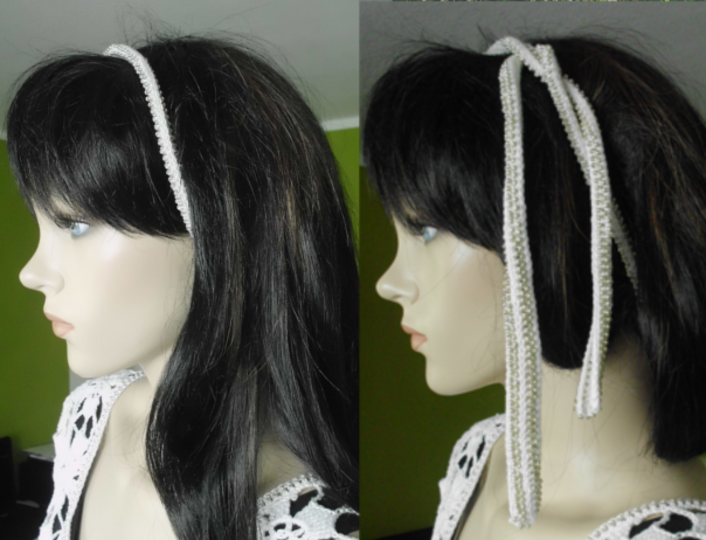 Das perlenbesetzte Band kann als Gürtel, Halsschmuck oder um den Kopf getragen werden, ganz nach Geschmack.