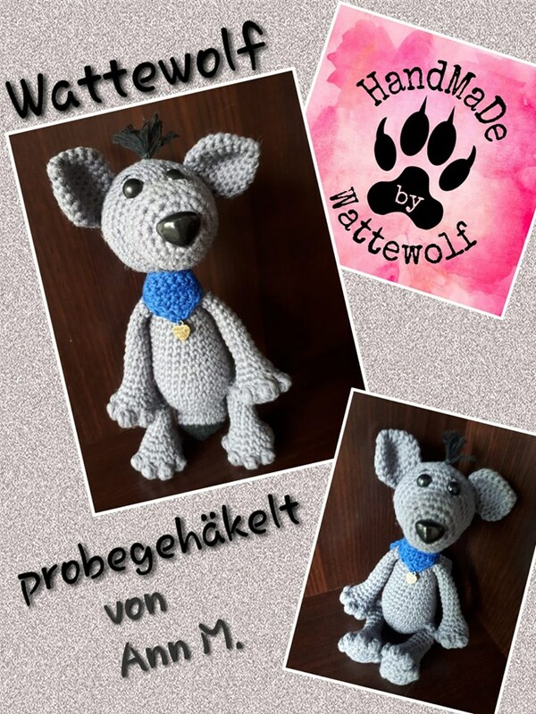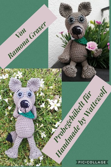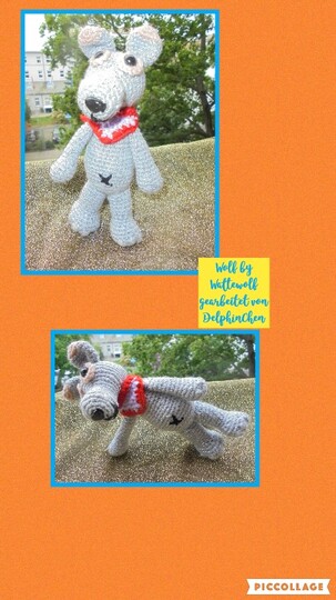 Wölfchen ist mit der angegebenen Wolle ca.17 cm groß. Dies variiert natürlich je nach Wolle, Nadelstärke und ob du fest oder locker häkelst.