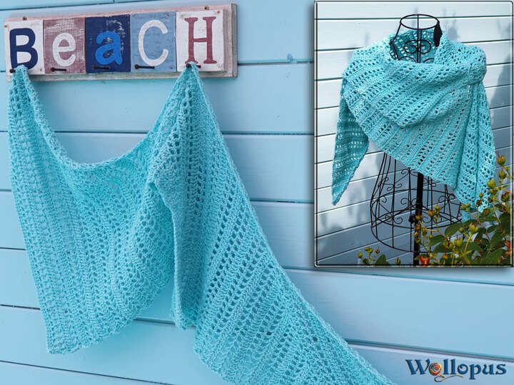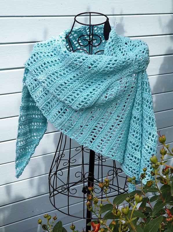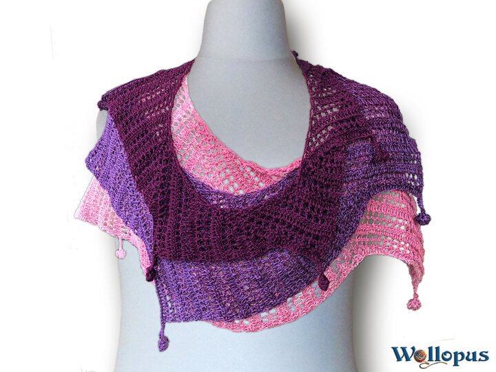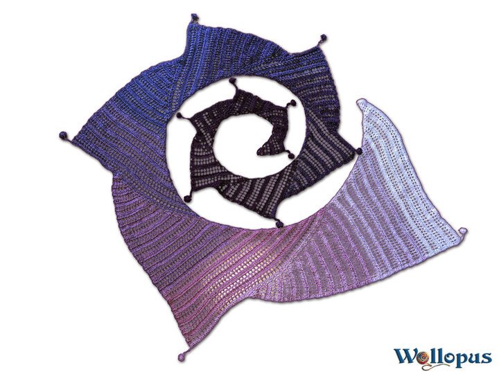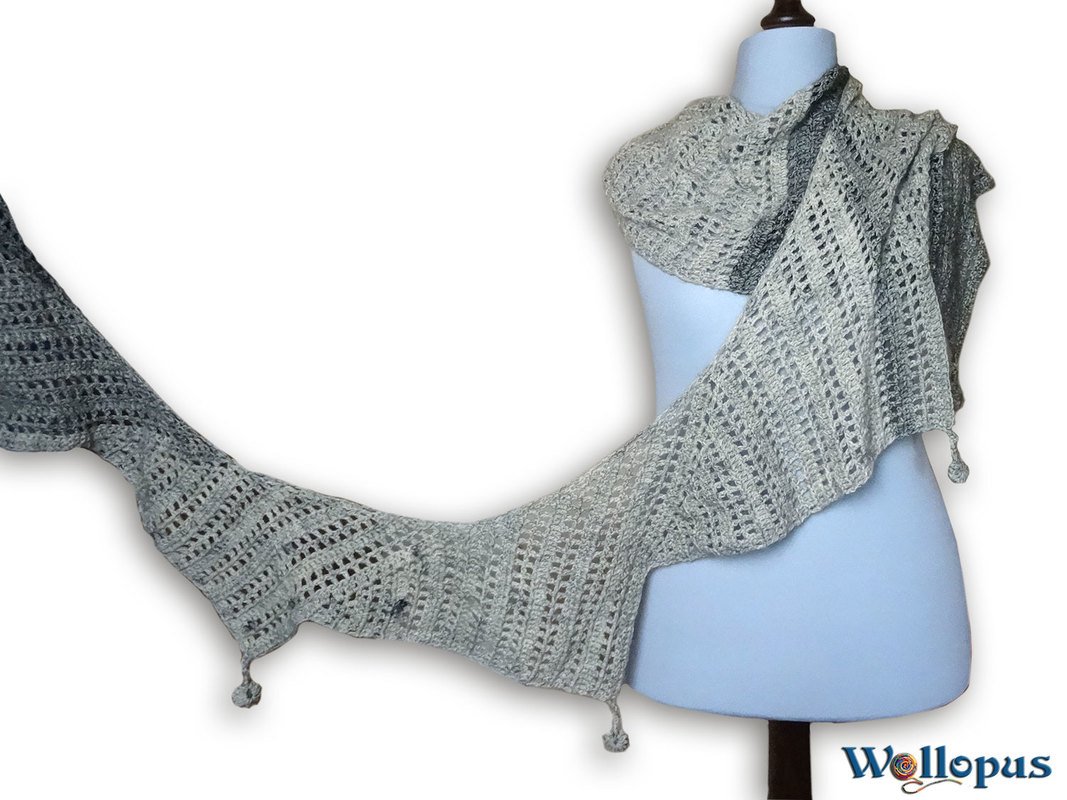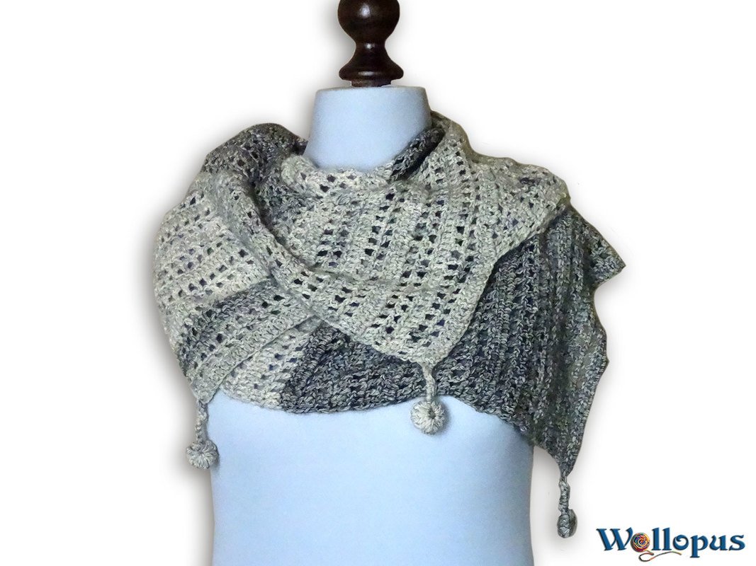 Er ist ein langgezogenes asymmetrisches Dreieck mit einer Besonderheit. Er ist krumm. Das passiert, wenn man die Zunahmen, egal ob gehäkelt oder gestrickt, nicht an den Rand setzt, sondern etwas zur Mitte hin.