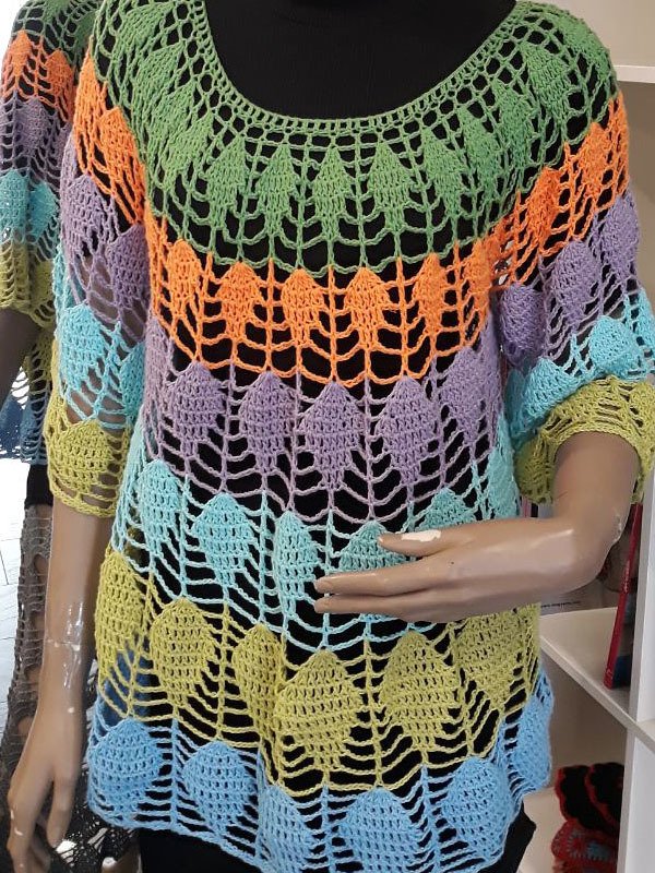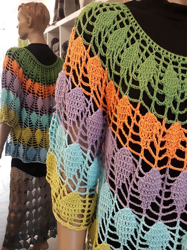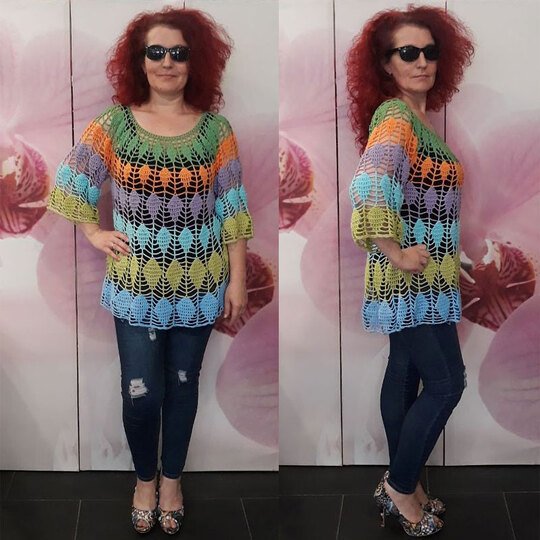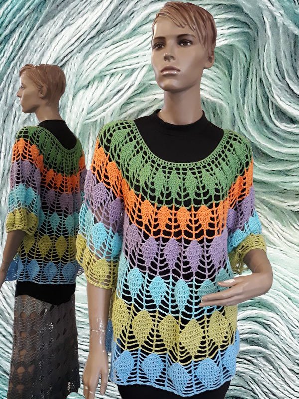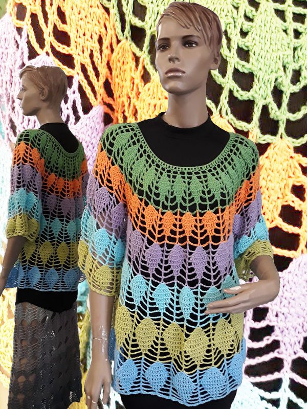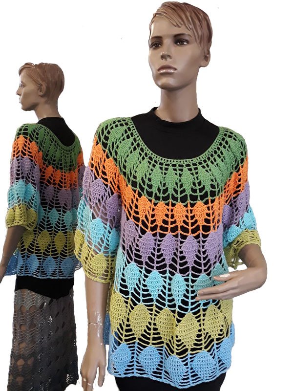 Der Pullover wird von oben nach unten in Runden gehäkelt, es sind 3 verschiedene Größen in der Anleitung angegeben.