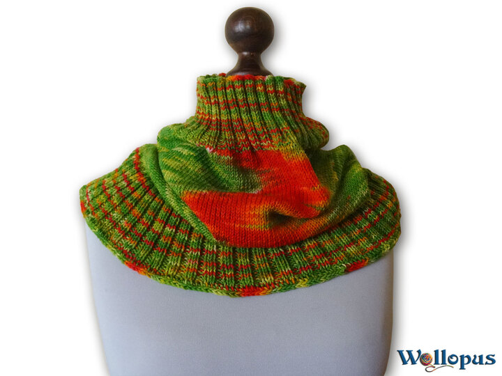 Diesen Loop habe ich mir ausgedacht, weil ich meine selbst gefärbte Wolle richtig schön zur Geltung bringen wollte. Sie sollte „wildern“ wie man das von Socken her kennt.
