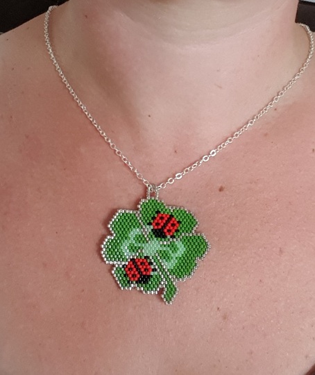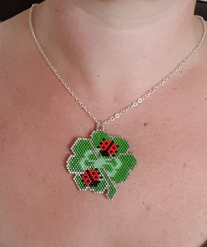 auf PDF die Vorlage für einen süßen Glückbringer-Anhänger mit Mengenangabe der benötigten Perlen, Foto des fertigen Werkes und eine Datei mit Perlenlegende und Zählmuster