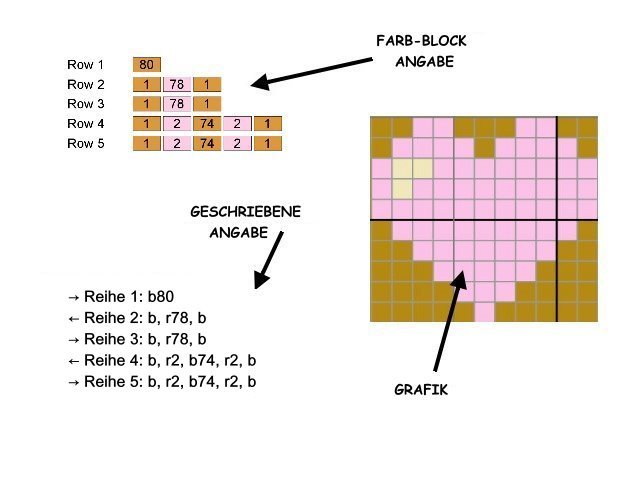 -farbige Zahlen-Blöcke für jede Reihe für feste Maschen (Stb od. hStb)