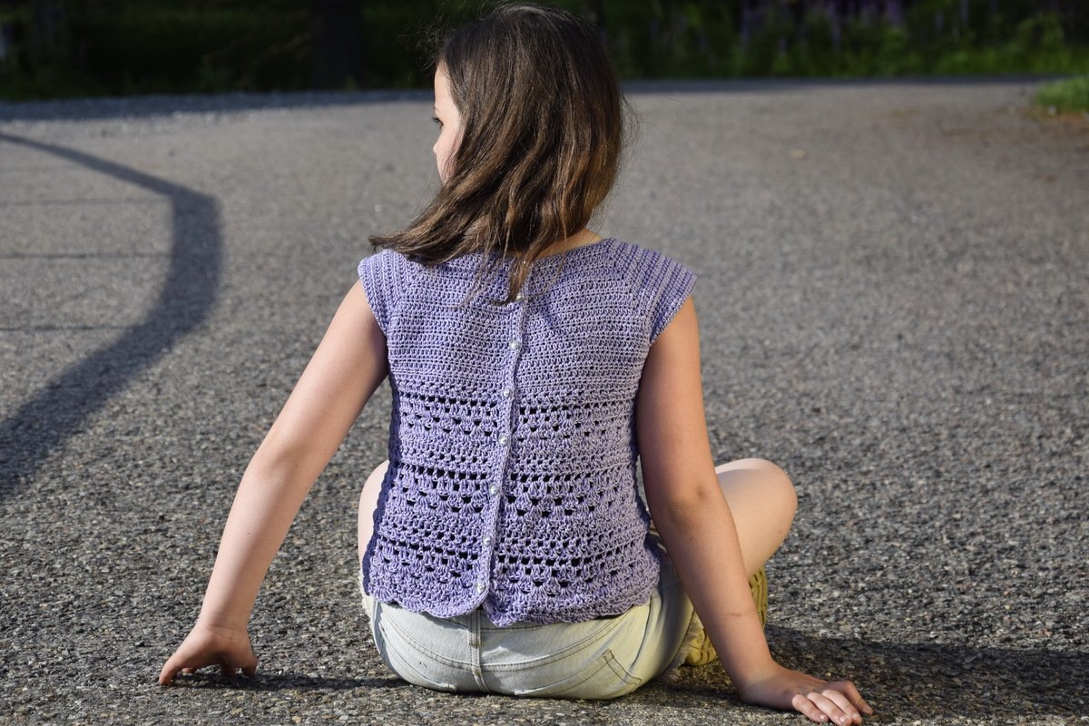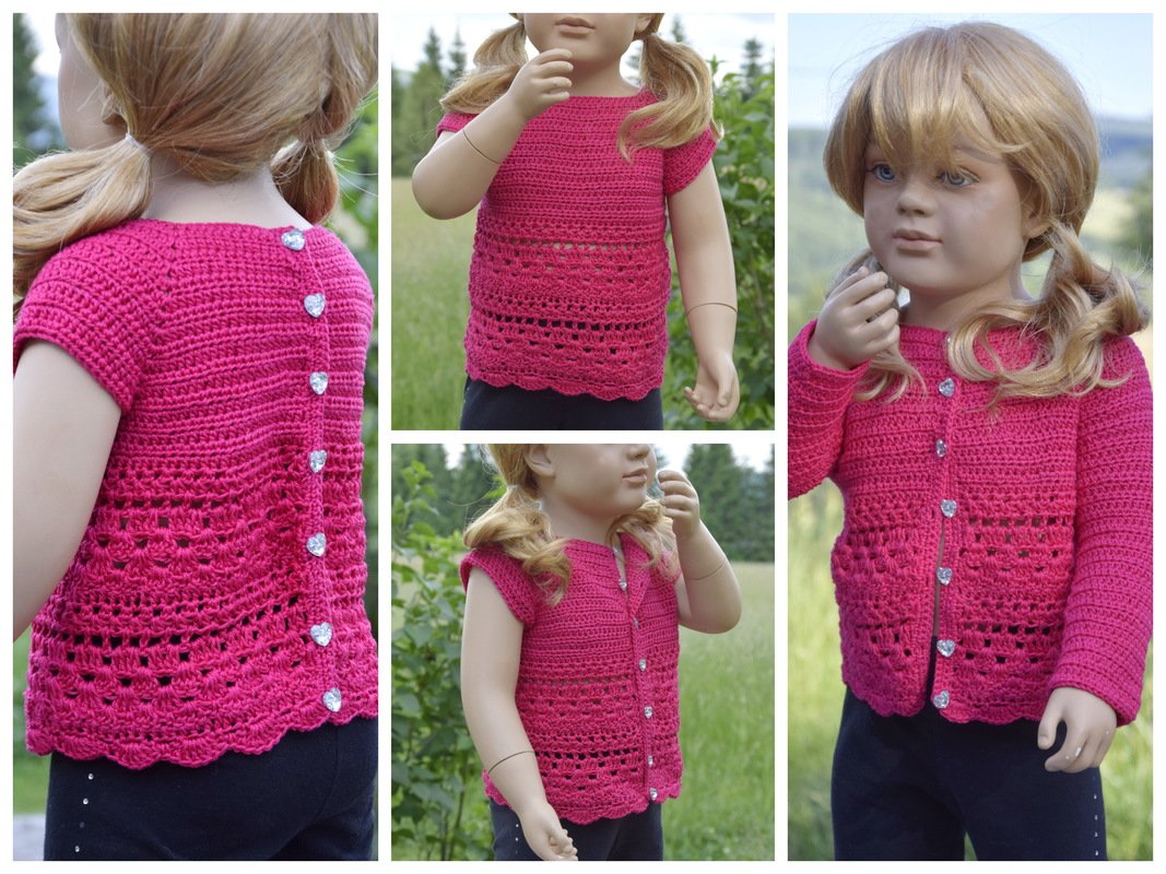 Du kannst das fertige Stück sowohl als Top mit der Knopfleiste am Rücken oder mit Knopfleiste vorn als kurzärmelige Weste tragen. Für kühlere Tage können die Ärmel verlängert werden, so ist es auch als Pulli mit Knopfleiste hinten oder als Jacke mit Knopfleiste vorn tragbar.