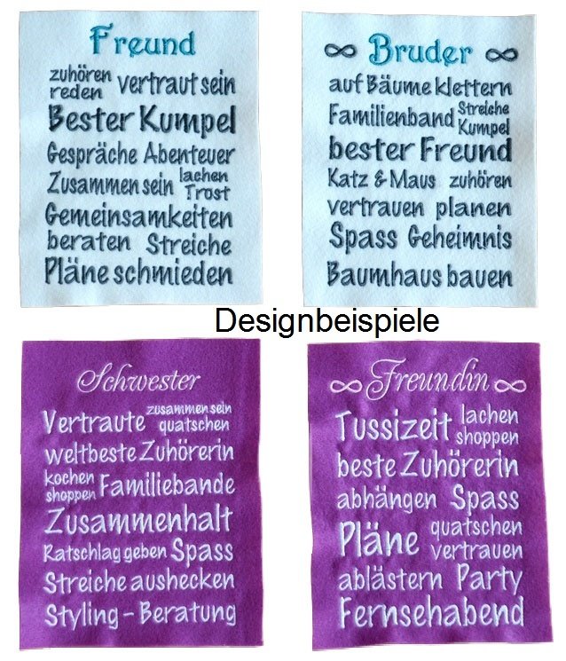 Du wolltest schon immer mal deiner Schwester, dem Bruder, deiner Freundin oder Freund stilvoll sagen wie lieb du sie hast und konntest es nie mit Worten ausdrücken? Genau dafür gibt es nun diese Schriften, mit denen du Schilder auf Filz oder Kunsteder sticken kannst um sie dann eingerahmt zu verschenken. Sehr ideal sind diese Schriften auch für Schürzen, Taschen, Lichtbeutel und viele Dinge mehr. Warum dem Freund oder Bruder nicht mal einen Kissen-Organizer für Männer schenken?
