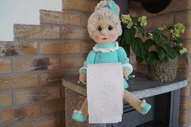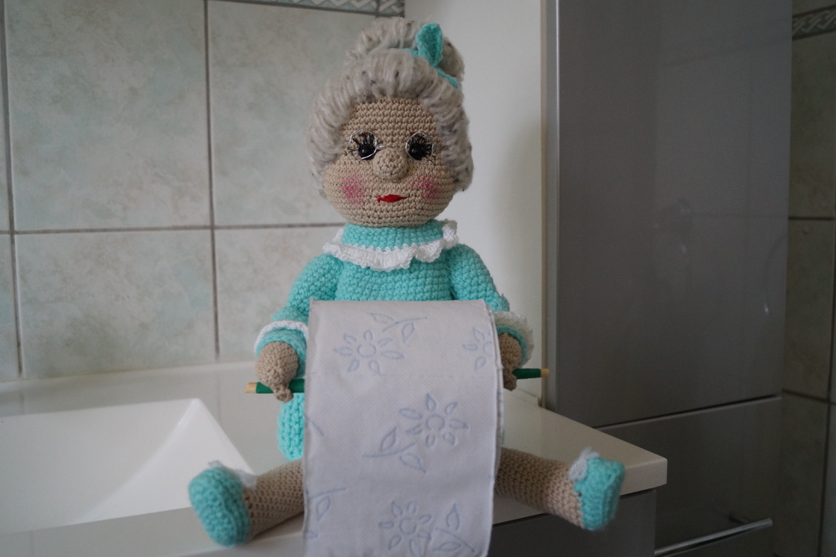 Toilettenpapierhalter mal anders ist Oma Ursula,mit einem freundlichen Gesicht hält sie geduldig die Rolle für Dich.