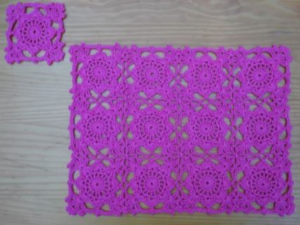 Grace your table with a set of pretty placemats and coasters that are crocheted in motifs. Twelve motifs are joined together as you work and edged with a picot border.