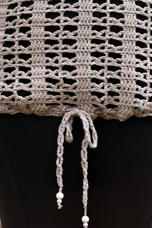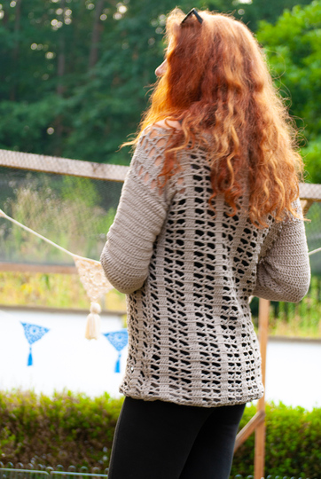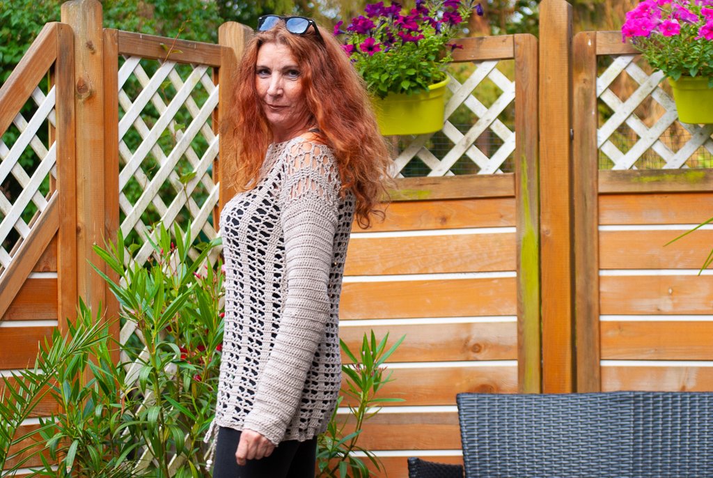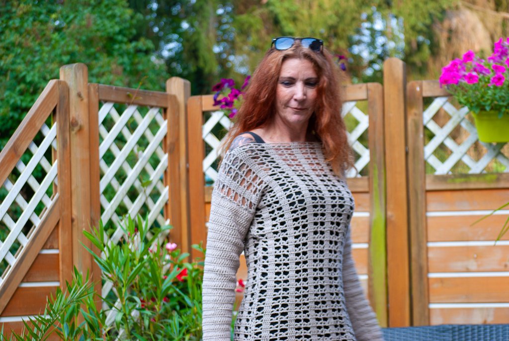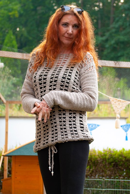 Häkelpulli "Vicky" ist durch die Kordel variabel in der Länge. Durch das interssante Muster ist der Pulli wunderbar luftig.