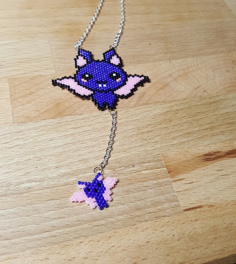auf PDF einmal die Vorlage für "Gregor die Fledermaus" und einmal für "Karlchen die Fledermaus" jeweils mit Mengenangaben der benötigten Perlen, Perlenlegende mit Farbcodes und Fotos der fertigen Werke