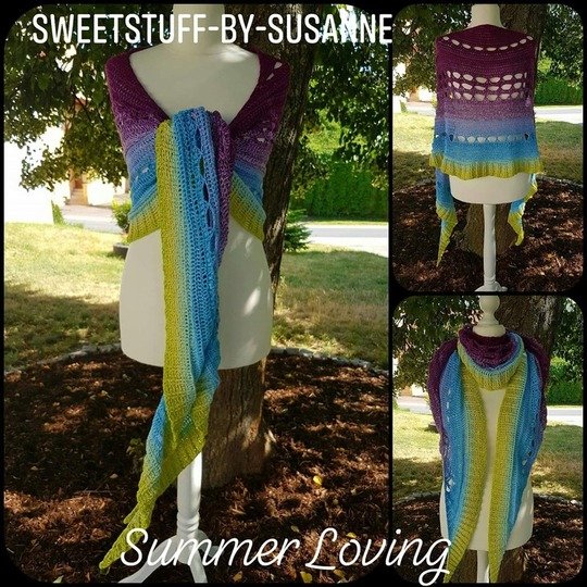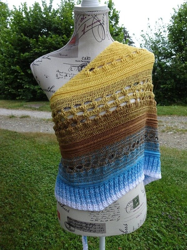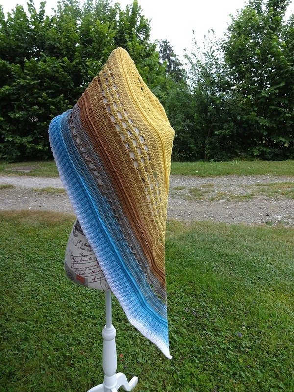Häkelst Du die halbrunde Version, so ergibt sich ein Farbverlauf von oben nach unten. Mit der rechteckigen Stola ergibt sich ein Farbverlauf von links nach rechts.