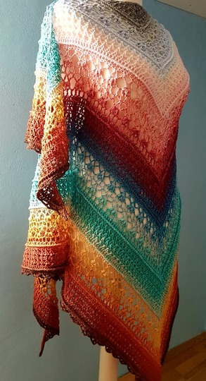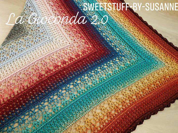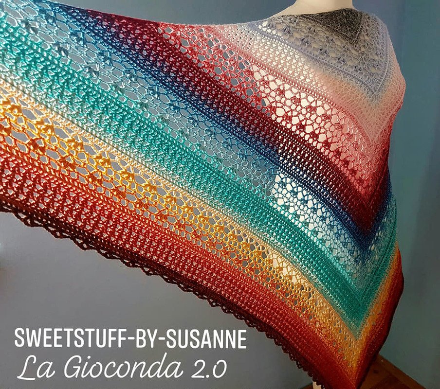 Das Tuch hat ebenfalls die traditonelle Form mit den üblichen Zunahmen an den Seiten und der Spitze, jedoch werden die beiden Muster der La Gioconda abwechselnd gearbeitet. So ensteht ein ganz neues Tuch, welches ein zartes, luftiges Muster, mit der Schlichtheit der Kreuzstäbchen vereint.