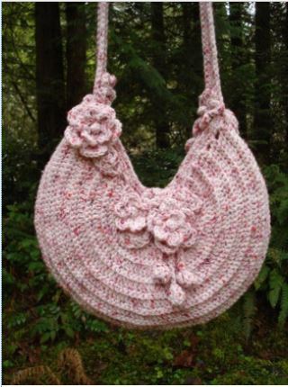 So pretty, this crocheted bag is a springtime "must-have". However, it would be just as fabulous in a wool yarn for winter. The bag is crocheted in two pieces (front and back) and a shoulder strap. A small pleat is formed on either side creating a gusset, then embellished with flowers, leaves and dangling buds.