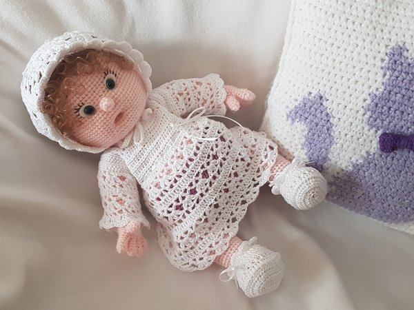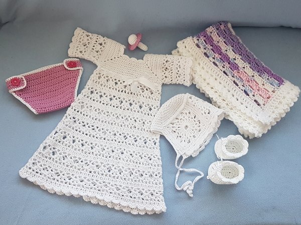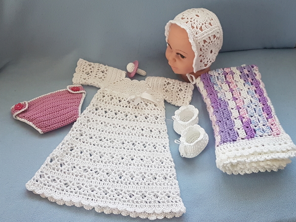Zur Garnitur gehören ein süßes Kleidchen, eine Haube, Babyschühchen und ein tolles Windelhöschen.
