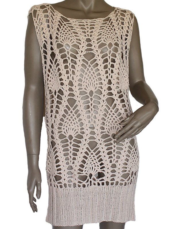 Großmaschiges Kleid gehäkelt mit gestricktem Bund.