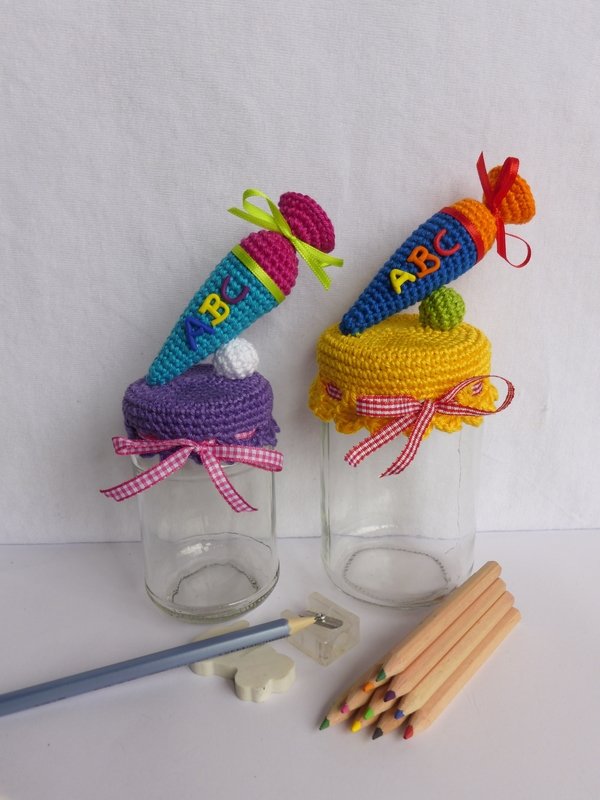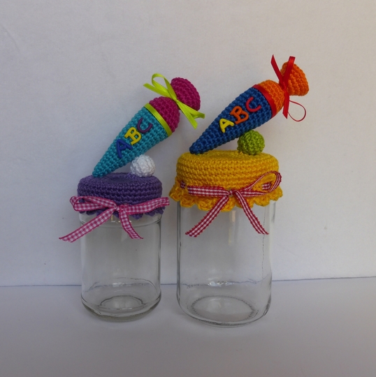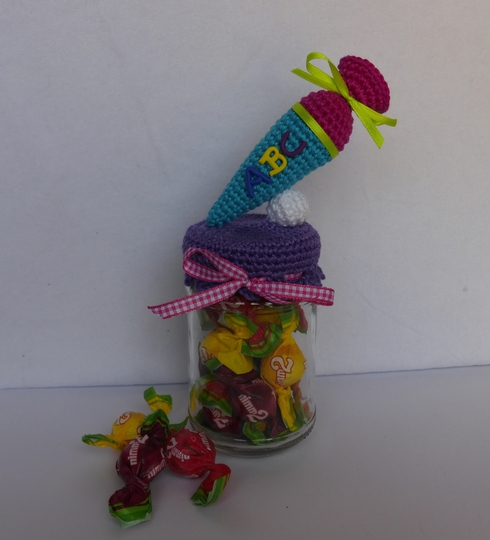 Angeboten wird eine ausführliche und gut bebilderte Häkelanleitung für das Bonbonglas Einschulung, nicht das fertige Glas. Die Anleitung umfaßt 9 Seiten.