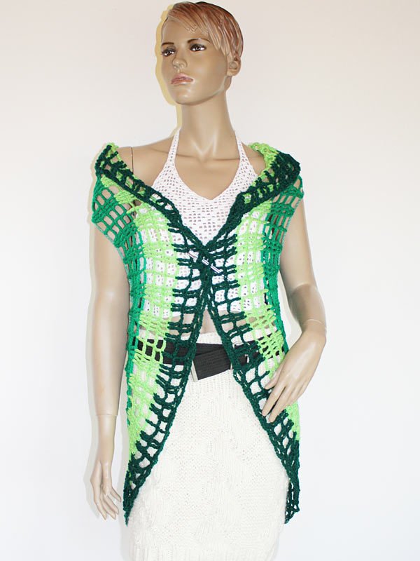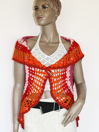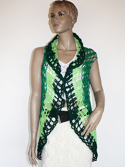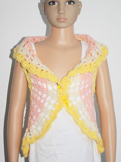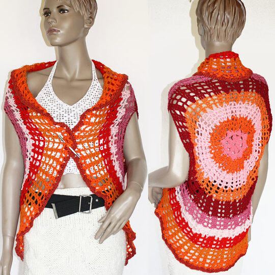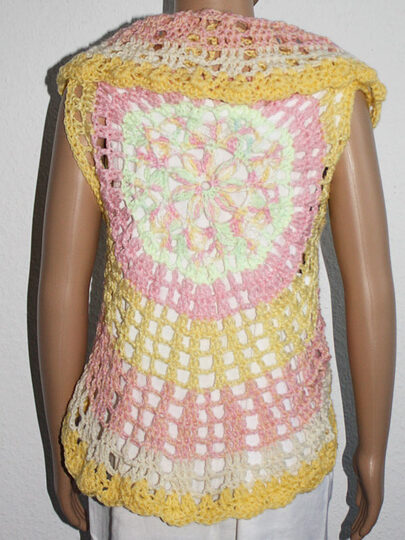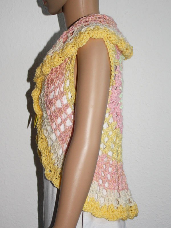 Leicht zu häkelnde Weste, perfekt für Wollreste. Sie wird in einem Stück gehäkelt ist super leicht und geht schnell. Grundmuster sind Stäbchen, sie kann aber auch mit Doppelstäbchen gehäkelt werden dann wird das Muster größer. Die Weste ist so gemacht, dass man sie ganz leicht abwandeln kann, mit kleinem Kragen, in einer anderen Größe, länger oder mit Rüsche oder, oder, oder...